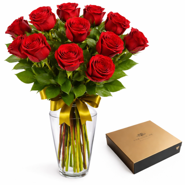 Florero con 10 rosas rojas combinadas por 6 varas de girasoles