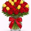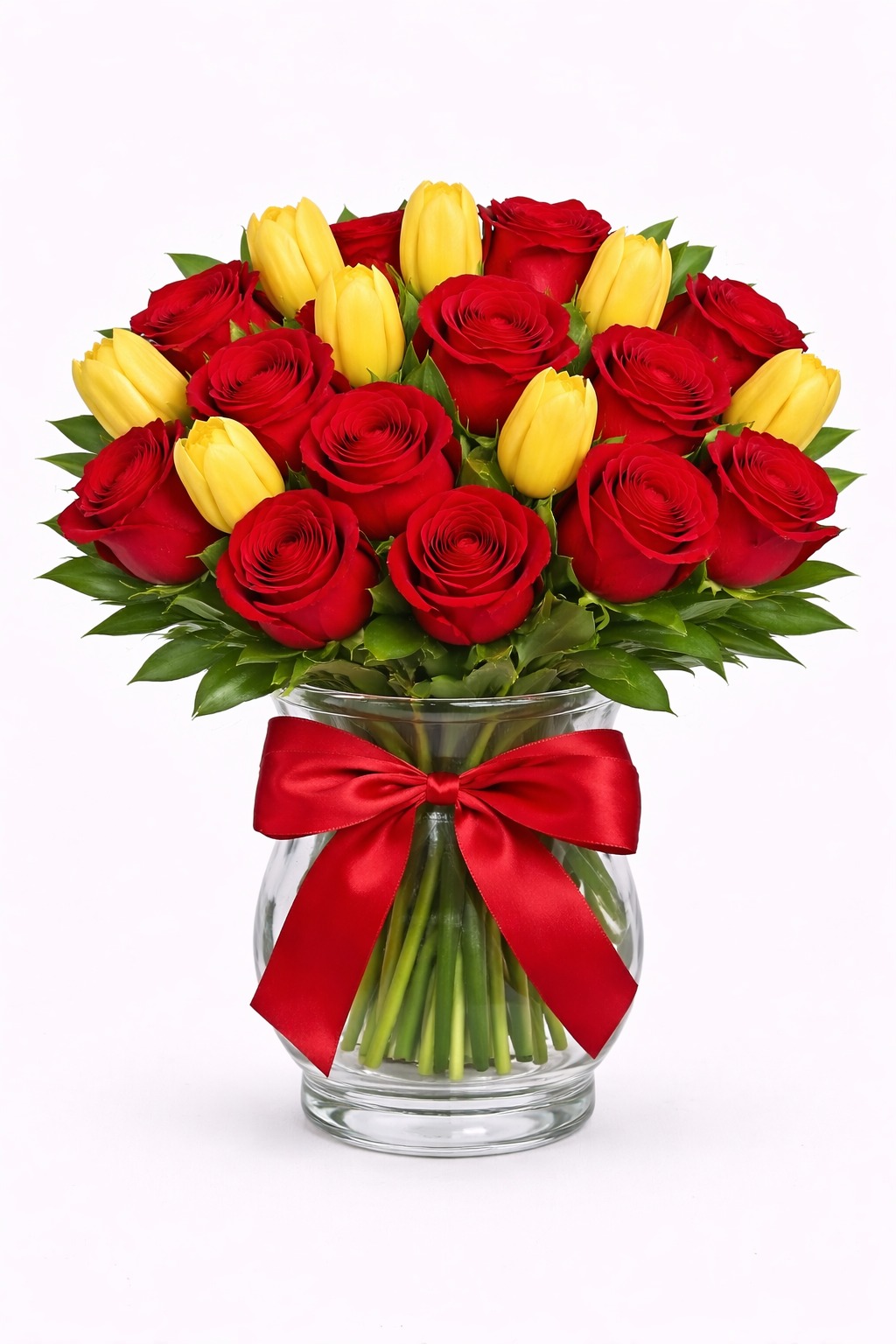 El Regalo Perfecto para el 14 de Febrero ¡Enciende la pasión con este florero exclusivo de 12 rosas rojas intensas y 10 varas de tulipanes amarillos vibrantes! Las rosas rojas simbolizan un amor eterno y ardiente, mientras que los tulipanes amarillos aportan alegría y calidez soleada, Cada tulipán amarillo está delicadamente entrelazado con una cinta de satén roja fina, simulando llamas danzantes que abrazan las rosas, ¡como un fuego romántico que no se apaga!Perfecto para conquistar en San Valentín: entrega fresca, dura más de 10 días y viene con una tarjeta personalizada. ¡Haz que este 14 de febrero sea inolvidable!