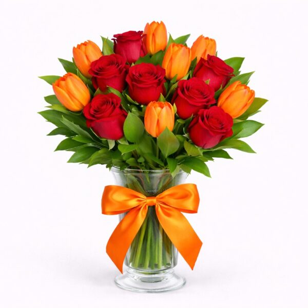 El Regalo Perfecto para el 14 de Febrero ¡Enciende la pasión con este florero exclusivo de 12 rosas rojas intensas y 10 varas de tulipanes amarillos vibrantes! Las rosas rojas simbolizan un amor eterno y ardiente, mientras que los tulipanes amarillos aportan alegría y calidez soleada, Cada tulipán amarillo está delicadamente entrelazado con una cinta de satén roja fina, simulando llamas danzantes que abrazan las rosas, ¡como un fuego romántico que no se apaga!Perfecto para conquistar en San Valentín: entrega fresca, dura más de 10 días y viene con una tarjeta personalizada. ¡Haz que este 14 de febrero sea inolvidable!