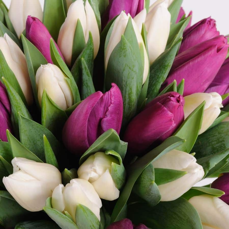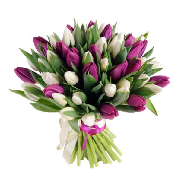 magnífico box con 50 bellos tulipanes, color morados y amarillos