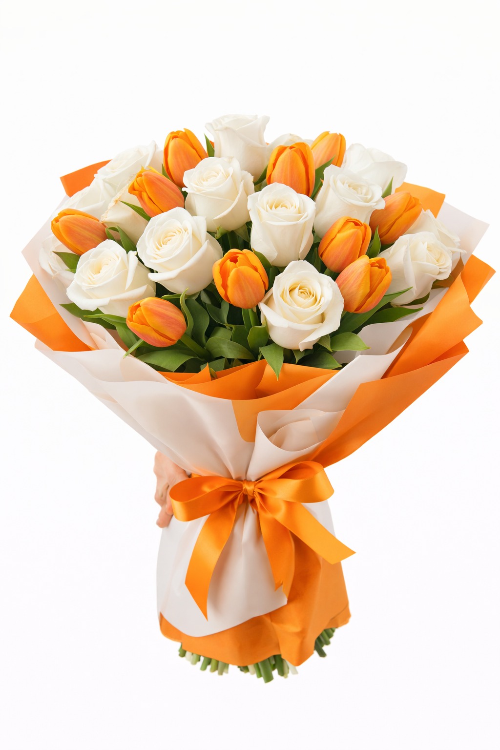 Sorprende este 14 de febrero con este hermoso elegante y fino ramo de 10 tulipanes naranjas vibrantes junto a la pureza y delicadeza de 10 rosas blancas frescas, cuidadosamente dispuestas en un elegante ramo, este conjunto transmite amor, gratitud y admiración, perfecto para expresar todo lo que sientes en su día especial ¡Haz que este Día del amor sea inolvidable con un detalle floral que hable desde el corazón! incluye linda tarjeta de saludos