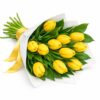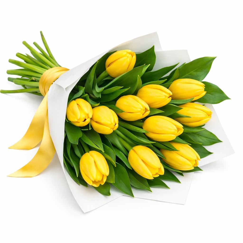 Hermoso arreglo en un bello ramo con 10 varas de tulipanes amarillos diseñado por un fino papel blancos y una conta de raso al tono delos tulipanes amarrado finamente por una fina cita de raso , incluye linda tarjeta de saludos.