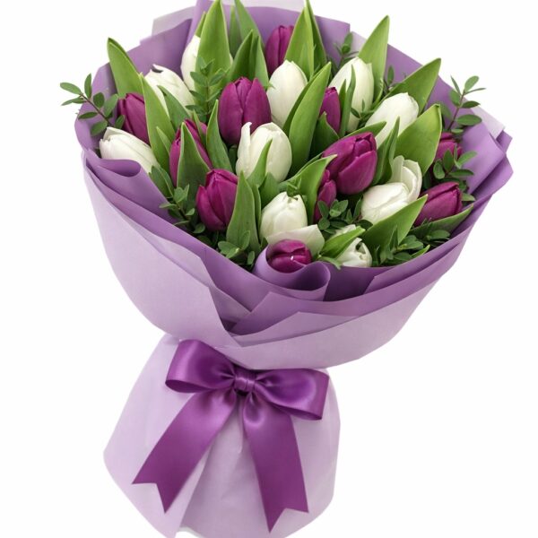Cesta con 15 rosas rojas y 15 varas tulipanes blancos a domicilio