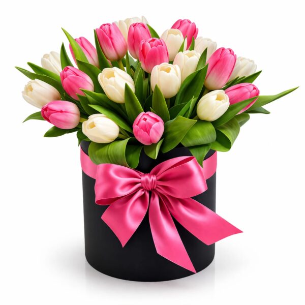 Box con 20 varas de tulipanes rosados y blancos para san Valentín