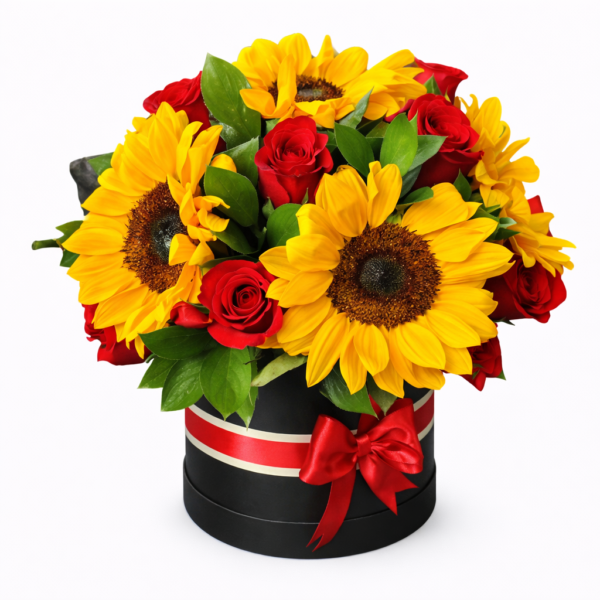 florero con 10 rosas rojas girasoles y gerberas rosadas a domicilio