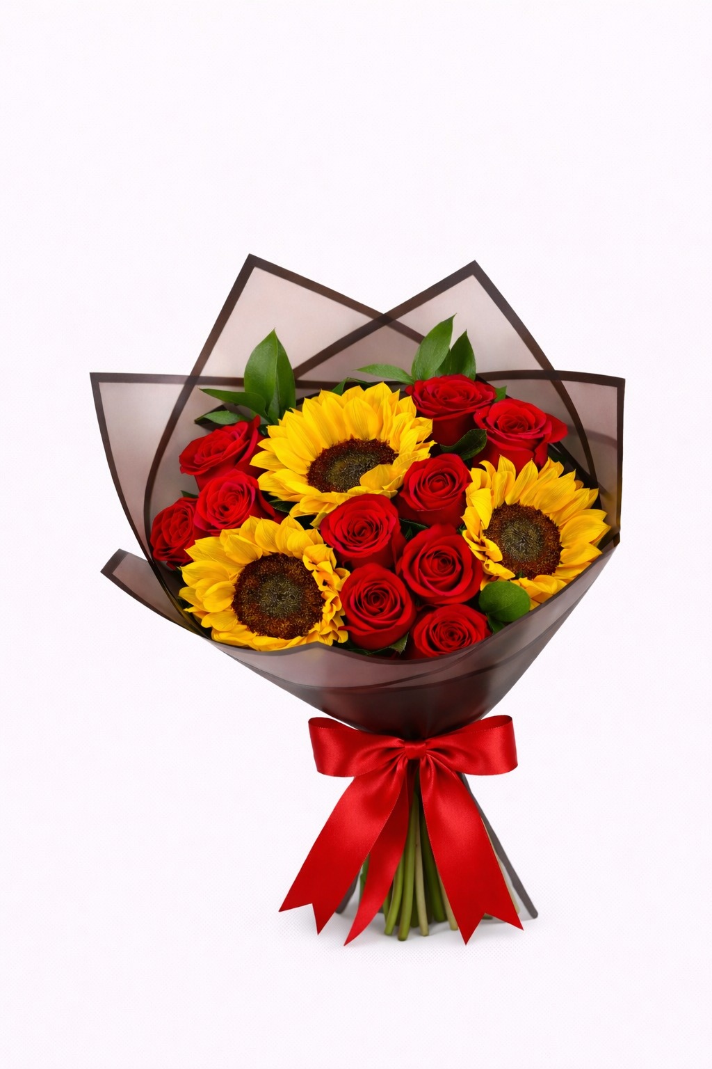 - Ramo con 12 rosas rojas ecuatorianas acompañadas por 10 varas de bellos girasoles