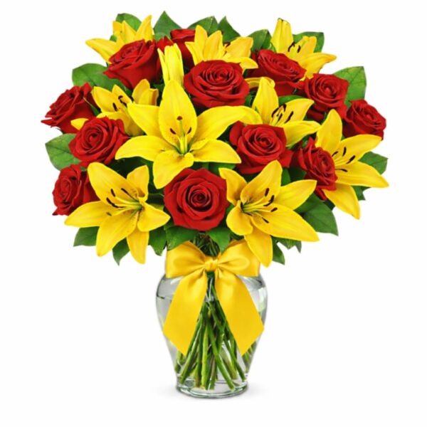 Florero con 12 rosas rojas y 10 varas de lilium amarillos código:RL-120