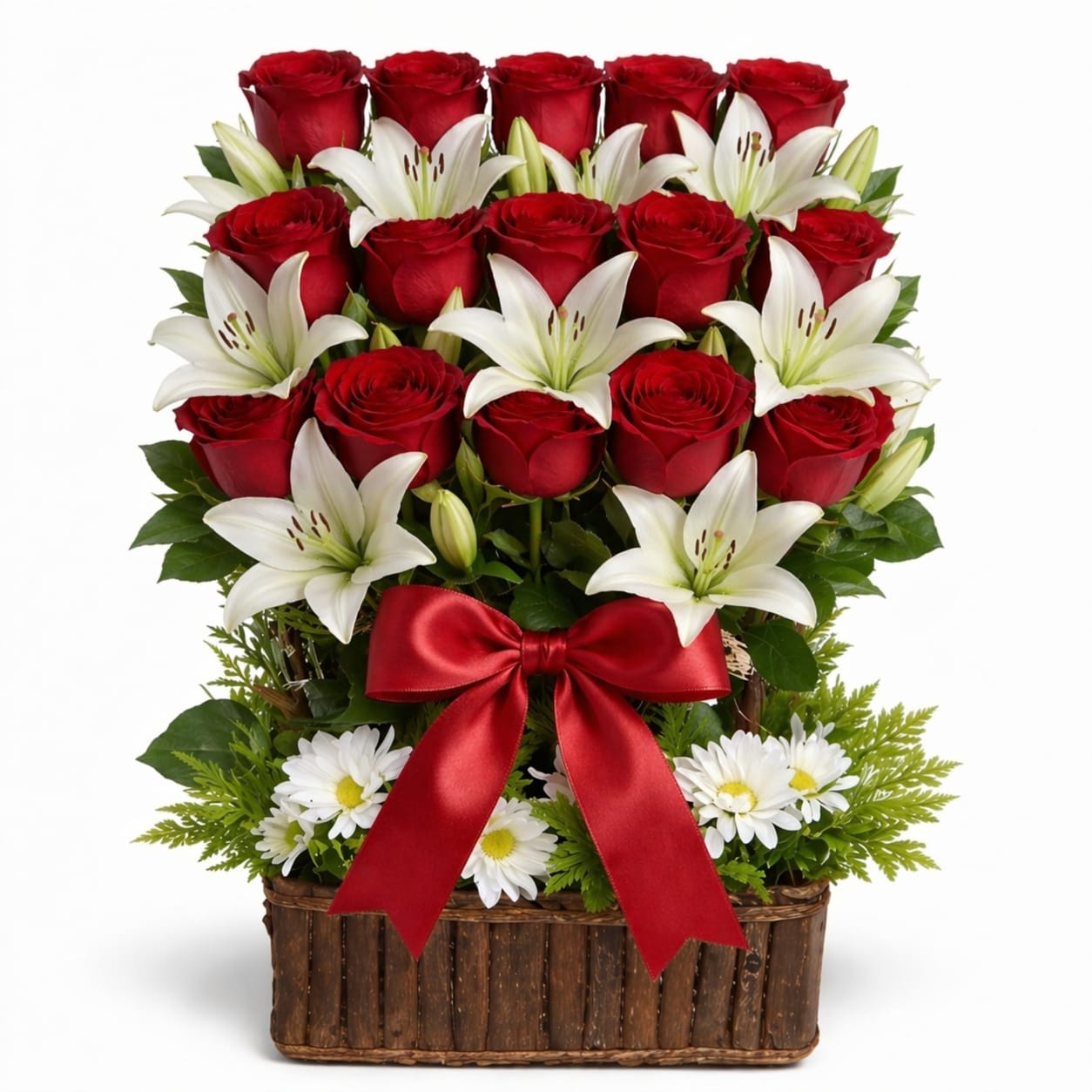 Quedarás con la boca abierta ante la majestuosidad de este arreglo frontal: 15 bellas rosas rojas, símbolo eterno del amor apasionado e inquebrantable, entrelazadas con varas elegantes de lirio blanco, cuya fragancia pura y significativa envuelve el alma como un abrazo divino. Perfecto para el Día de la Mamá, este diseño exalta la fuerza y ternura de quien nos dio la vida, con pétalos vibrantes que irradian calidez y pureza. ¡Un regalo que dice «Te amo» sin palabras, dejando un aroma inolvidable en su corazón,incluye linda tarjeta de saludos