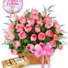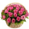 - Fina canasta con 25 rosas Ecuatorianas color damasco y follaje