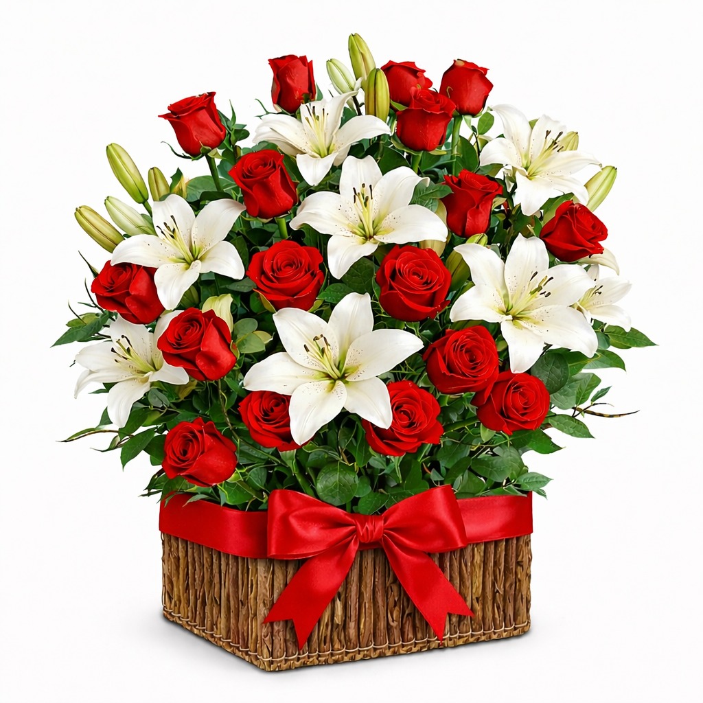 ¡Sorprende a la mujer más importante de tu vida con 15 rosas rojas vibrantes y 10 varas de lilium perfumados en una elegante canasta cuadrada! Un regalo lleno de pasión, elegancia y cariño eterno. Ideal para decirle «Te amo, mamá» de la forma más especial. 🌹💐