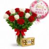 Celebra a la mamá más especial con este florero lleno de amor y dulzura! Incluye 12 rosas rojas y blancas frescas y exuberantes, símbolo de cariño tierno y admiración eterna. Acompañadas de deliciosos bombones belgas premium, para un toque gourmet que derretirá su corazón (¡y su paladar!). Completa el regalo con un globo metálico «Feliz Día de la Mamá», brillante y festivo, que flotará con alegría.Perfecto para entregas en Santiago y alrededores. ¡Hazla sonreír hoy!