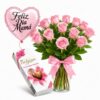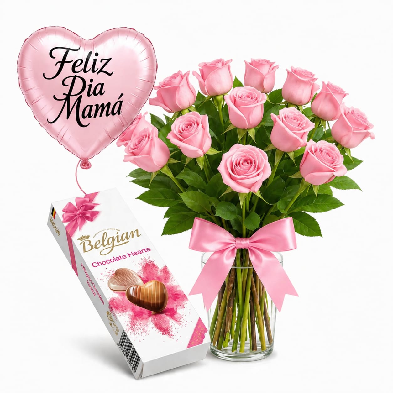 Celebra a la mamá más especial con este florero lleno de amor y dulzura! Incluye 12 rosas rosadas naturales, frescas y exuberantes, símbolo de cariño tierno y admiración eterna. Acompañadas de deliciosos bombones belgas , un toque gourmet que derretirá su corazón (¡y su paladar!). Completa el regalo con un globo metálico «Feliz Día de la Mamá», brillante y festivo, Perfecto para entregas en Santiago y alrededores. ¡Hazla sonreír hoy! 💕🌹🍫
