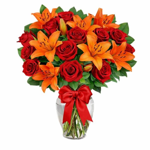 Florero con 10 tulipanes amarillos y 10 rosas rojas ecuatorianas