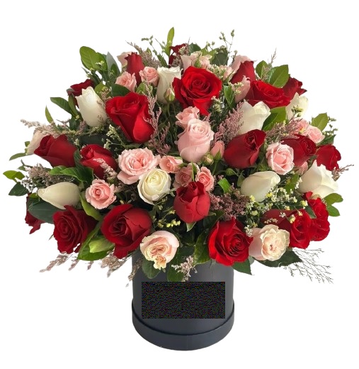 Exclusiva Box con 50 rosas ecuatorianas rojas, rosadas y blancas ecuatorianas