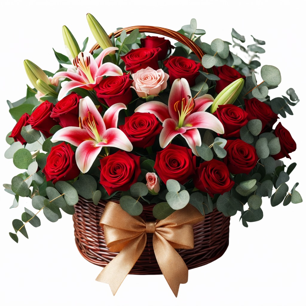 14 de febrero conquista con esta Delicada canasta de mimbre trenzado a mano, rebosante de 25 rosas rojas y rosadas en perfecta armonía, simbolizando la pasión ardiente y el cariño tierno que enciende los corazones. Cada pétalo vibra con frescura, envuelto en el elegante lilium oriental rosado, cuya fragancia embriagadora susurra promesas de amor eterno. El conjunto se corona con fino follaje de eucalipto, aportando un toque verde sofisticado y un aroma refrescante que evoca jardines secretos. Ideal para San Valentín: declara tu amor con esta obra maestra floral, entregada fresca y lista para conquistar. ¡Haz que su corazón florezca! Este 14 de febrero