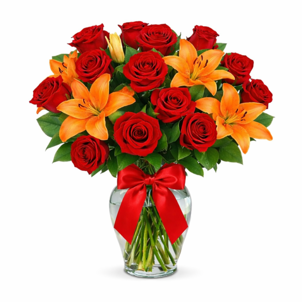Florero con 12 rosas rojas y 5 varas de lilium naranjas
