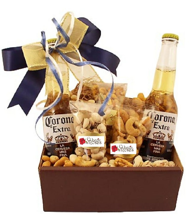 Cesta cuadrada con frutos secos y 4 cervezas